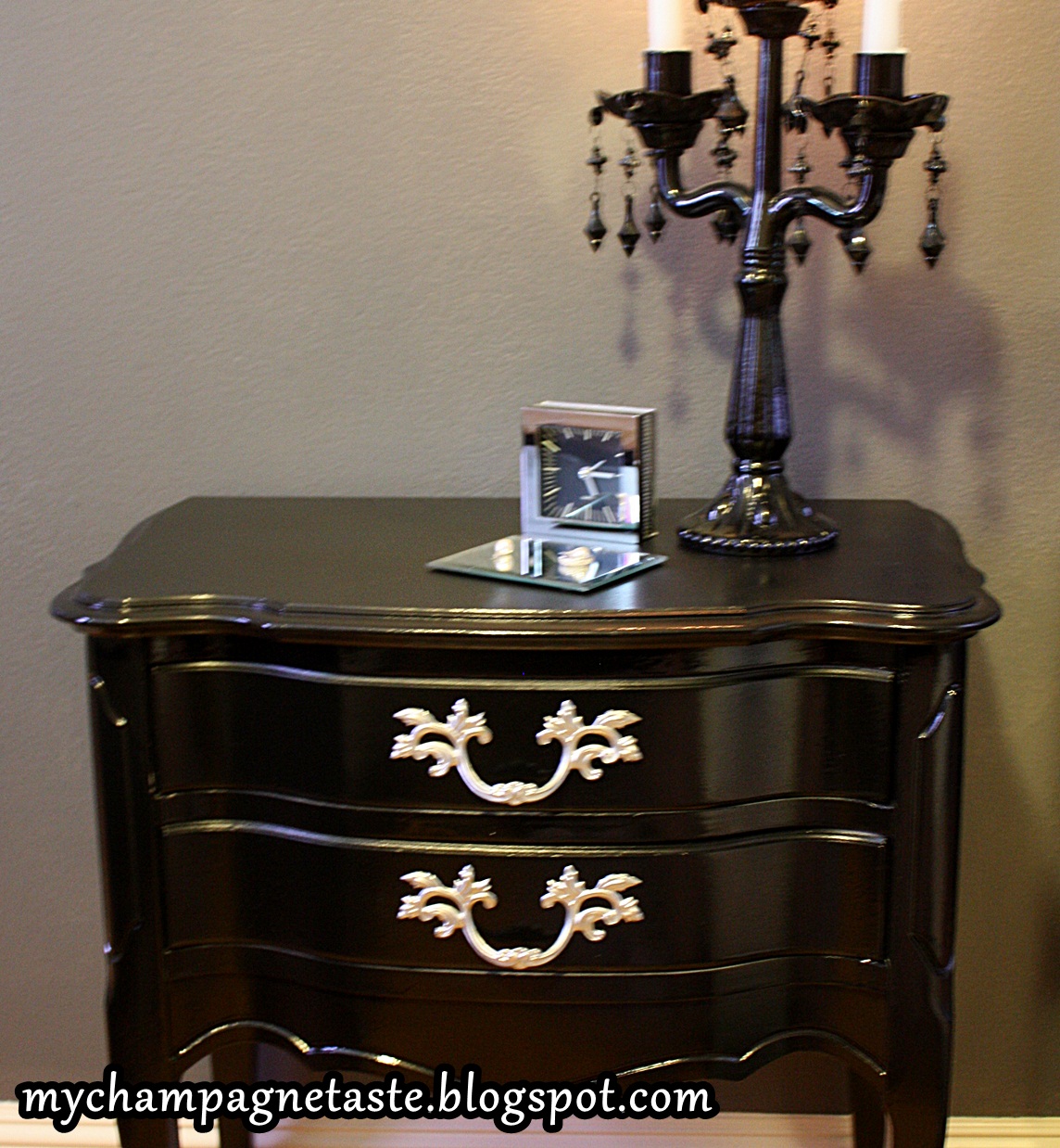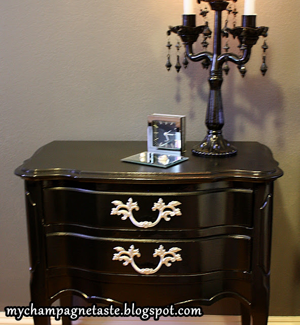 Now time for spray paint, I used Rustoleum Black Gloss, I wanted to have a glossy surface so my nightstand doesn’t look dull in front of my shiny silver leaf dresser. I applied almost 3 light coats of black spray paint. ( always 2 or 3 lights coats are  better than 1 heavy coat, like the nail polish concept).